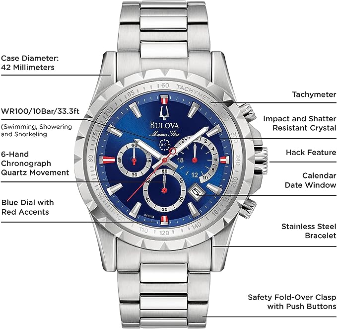 Bulova Men’s Marine Star 6-Hand Quartz Chronograph Stainless Steel Watch, Blue Dial, Tachymeter, 100M Water Resistant