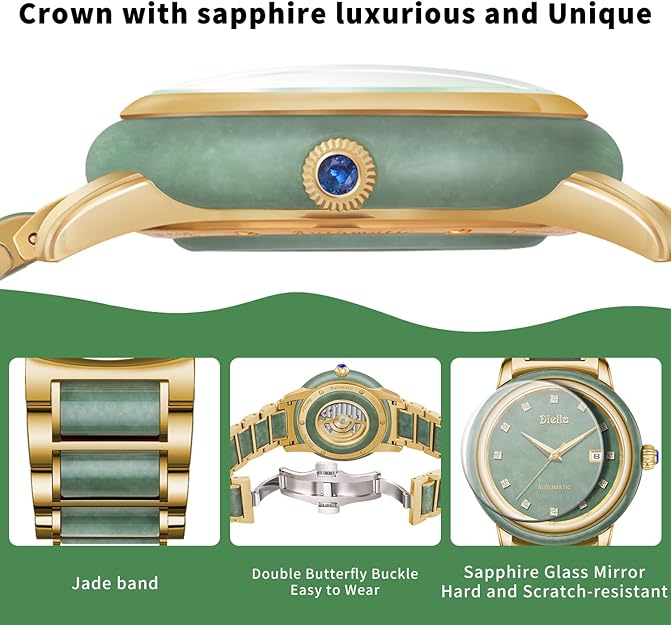 Diella Gold Men's Automatic Mechanical Watch, Luxury Retro Green Jade Wrist Watch for Men with Date Luminous, Round, Waterproof