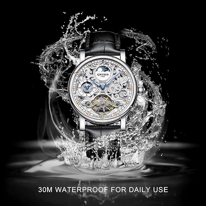 Mens Mechanical Watches, Luxury Automatic Skeleton Tourbillon Watch Waterproof Crystal Self-Winding Wrist Watch for Men