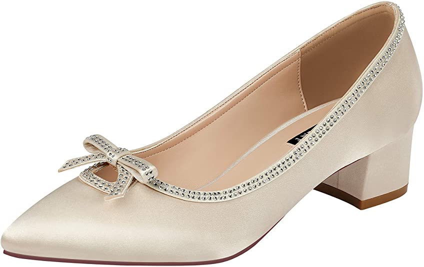 Women Comfort Pumps Chunky Block Low Heels Closed Toe Rhinestones Satin Wedding Bridal Shoes