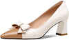 Women's Genuine Leather Pointed Toe Handmade Bowknot Mid Chunky Heels Cute Pumps Shoes