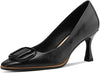 Women's Genuine Leather Square Toe Handmade Stiletto Mid Heels Pumps Shoes with Buckle