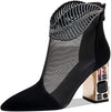 Women's Genuine/Suede Leather with Mesh Pointed Toe Handmade Jewel High Chunky Heel Chic Ankle Boots with Back Zipper